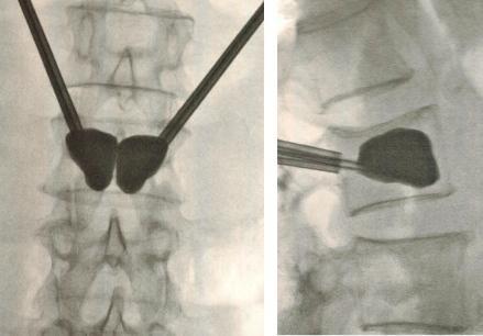 2. Inserção das Cânulas: duas agulhas são inseridas através da pele, guiadas por fluoroscopia (raio-X em tempo real), ultrapassando os pedículos vertebrais até o corpo vertebral fraturado.