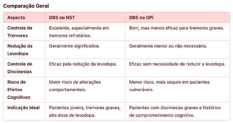 - Ajustes: Necessidade de ajustes na dose de levodopa pode ser menor em comparação com a DBS no NST.
