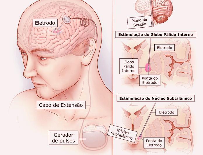 A DBS envolve a implantação de eletrodos em áreas específicas do cérebro, geralmente o núcleo subtalâmico (NST) ou o globo pálido interno (GPi). Esses eletrodos estão conectados a um gerador de pulsos elétricos (neuroestimulador) implantado sob a pele, geralmente na região do tórax. O neuroestimulador envia impulsos elétricos contínuos ou intermitentes, modulando a atividade anormal das vias neuronais associadas aos sintomas motores da doença.