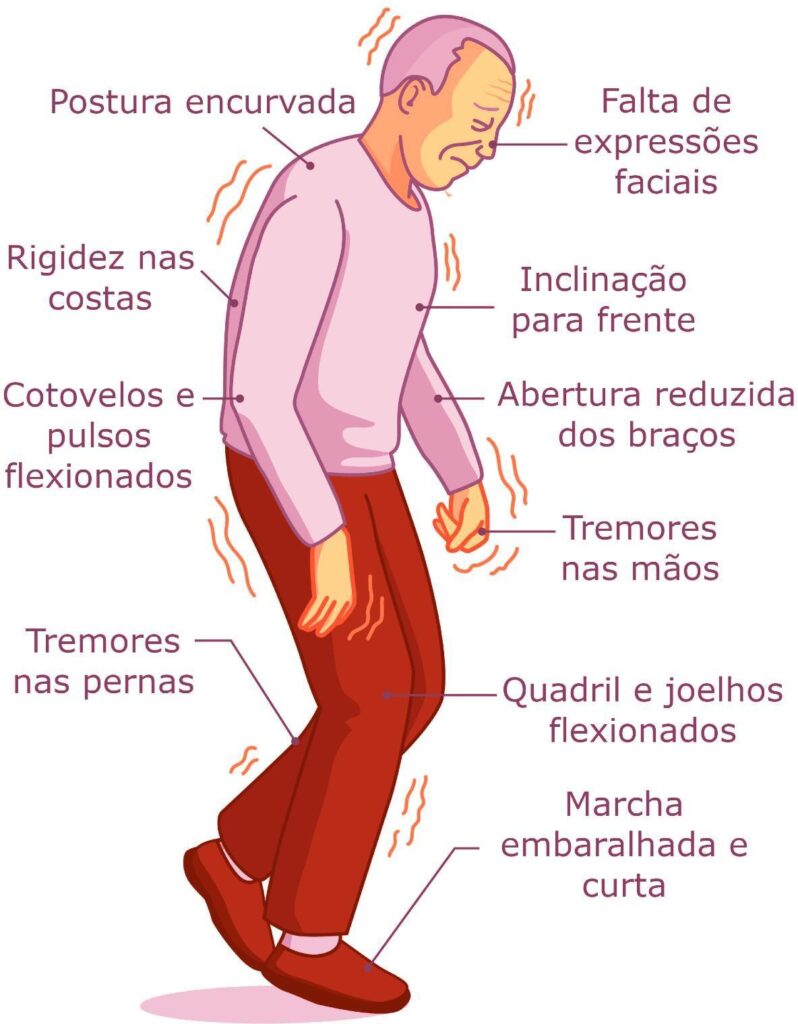 - Tremores: movimentos involuntários, geralmente iniciados nas mãos.