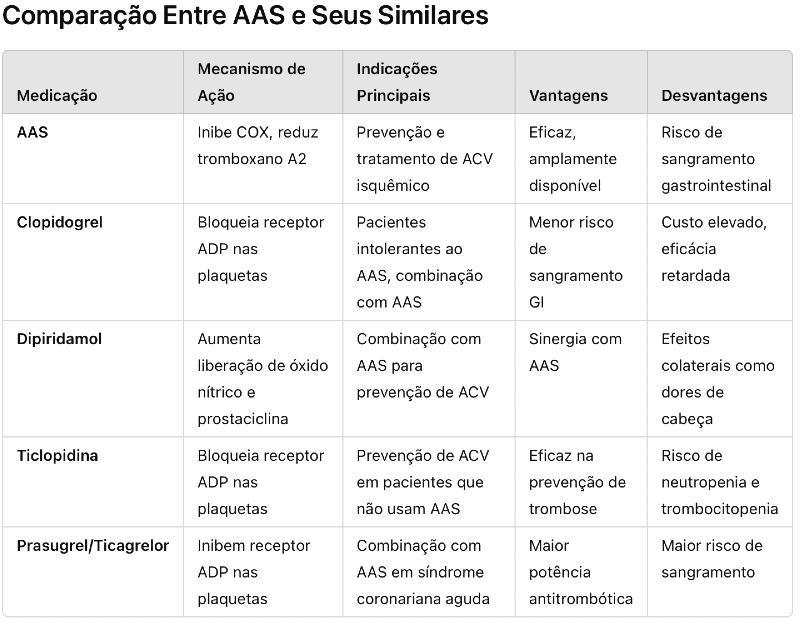 - A.A.S. + Clopidogrel ou A.A.S. + Dipiridamol: em alguns casos, a combinação pode ser escolhida para aumentar a eficácia na prevenção de novos A.V.C.s.